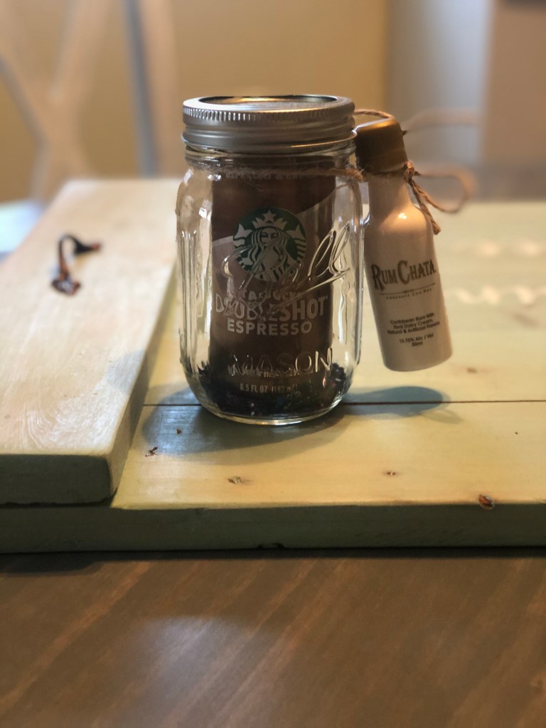 My previously hot coffee, neglected, quickly turned cold. Finally, I settled on a simplistic concept: mason jars filled with either mini Coca Cola cans or mini Starbucks canned expressos. Tying twine along the lid, I would attach a small miniature bottle of corresponding liquor. We had a winner- and how cute it was! I was getting excited!